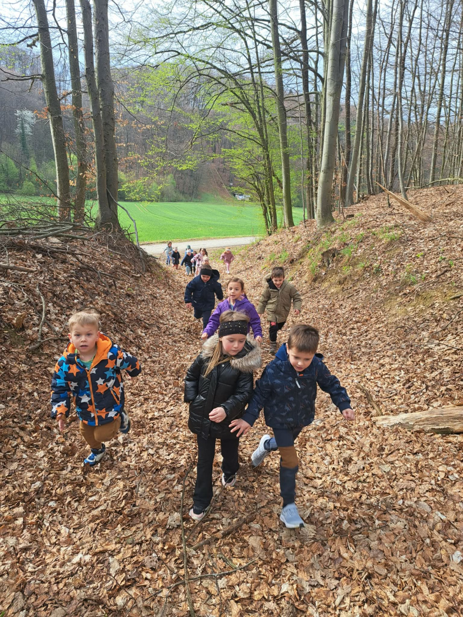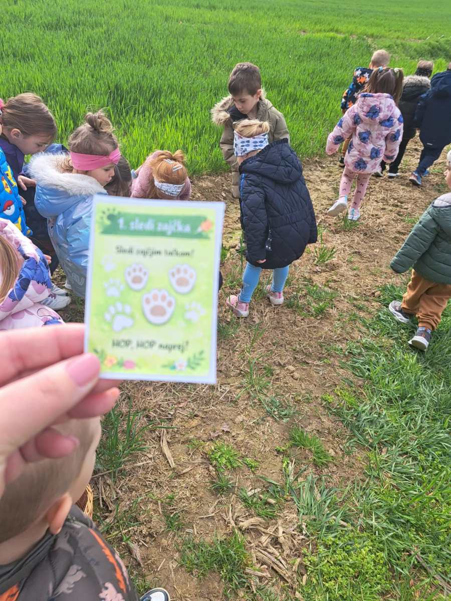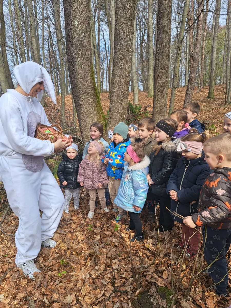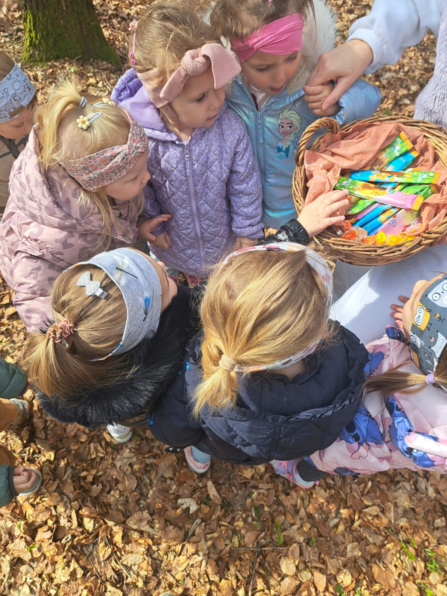 Petek, 3. aprila, se je za skupini Palčki in Lunice začel zelo zanimivo, saj nas je v igralnici pričakalo skrivnostno pismo velikonočnega zajčka. Povabil nas je na skupni razburljiv lov do sladkega presenečenja v gozdu, kjer je otrokom pripravil gibalne in zanimive naloge, povezane z naravo in naravnimi materiali, ki jih gozd ponuja. Ob raziskovanju so otroci skozi igro spoznavali koliko možnosti nam gozd ponuja za gibanje, igro, sodelovanje in razvijanje domišljije. Vsaka naloga nas je vodila bližje cilju, zadnja pa nas je pripeljala naravnost do zajčka s sladkim presenečenjem, ki je na otroške obraze pričaral iskrene nasmehe.